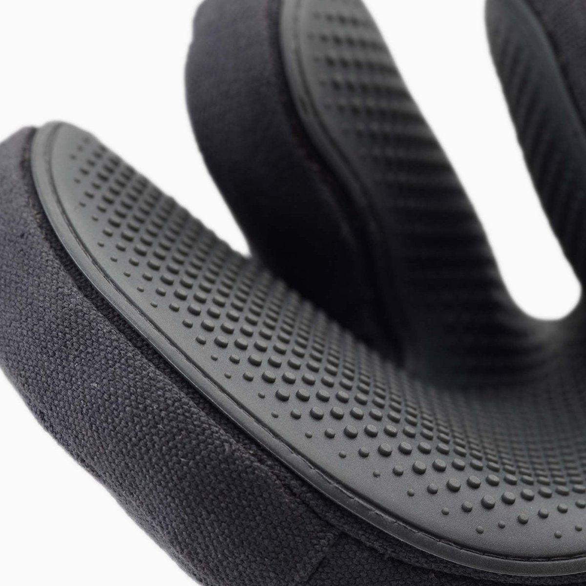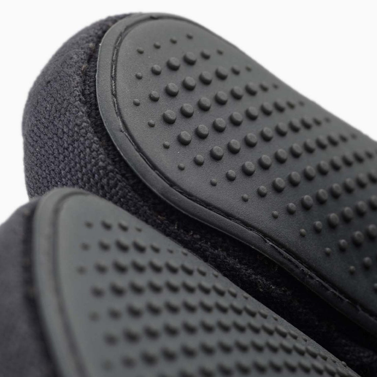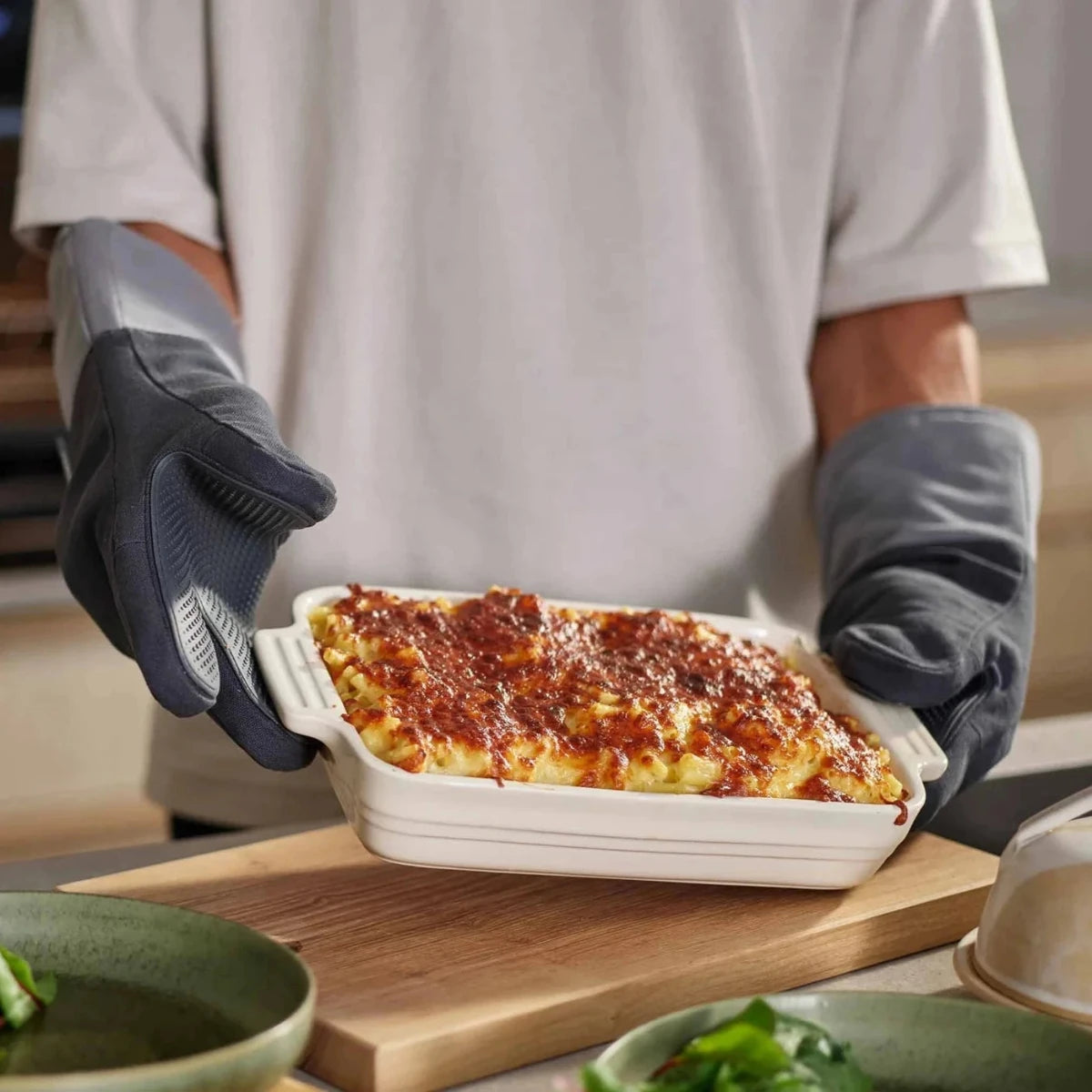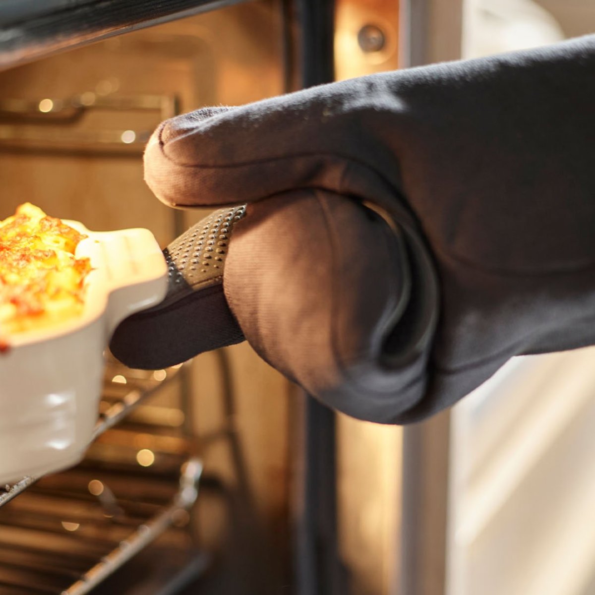 This clever design separates out the index fingers of each hand, offering much more dexterity and control when handling hot cookware. The palms get the high heat-resistant treatment with silicone grips and there's padded cotton cuffs for premium comfort. This set of two features both right and left-handed gloves.