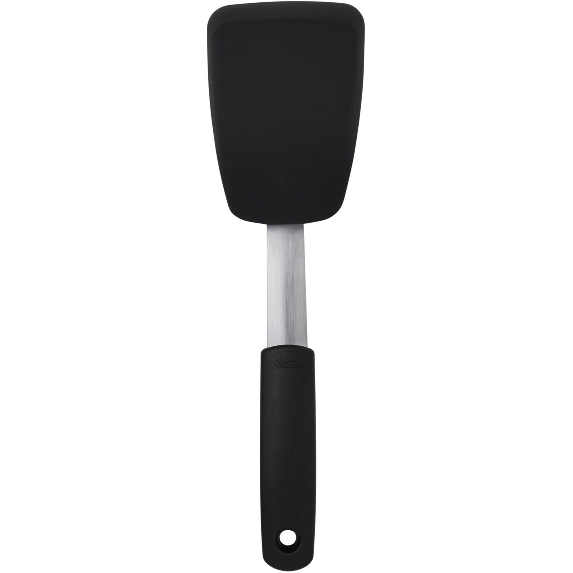 The OXO Silicone Flexible Turner - Small Black is designed to work with you and any recipe in your kitchen. Experience the strength of its stainless steel blade combined with the heat resistance and non-stick friendliness of its silicone outer layer, giving you confidence as it glides easily under foods to flip them while keeping them intact.